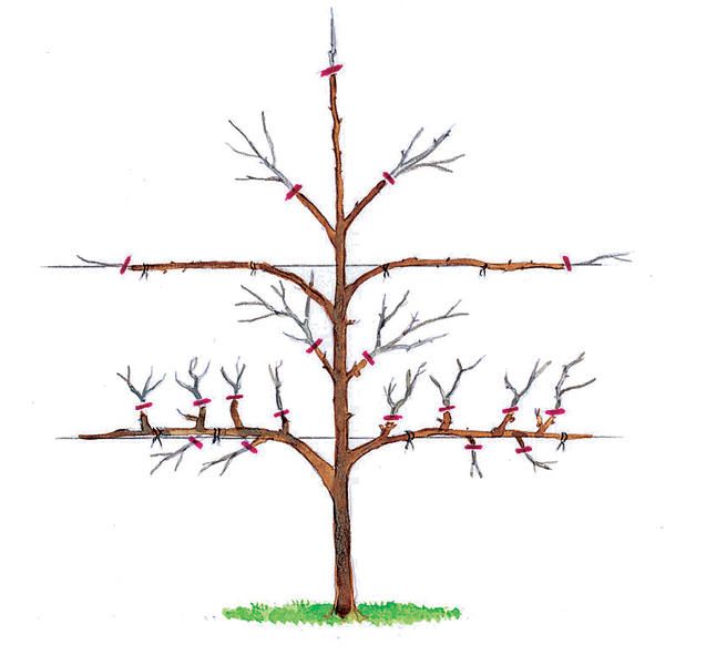 Если есть лидер, который длиннее других побегов на 5–6 почек, и хорошо развитые боковые приросты, то при формировании ярусной кроны используют классическую схему обрезки: