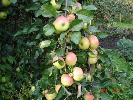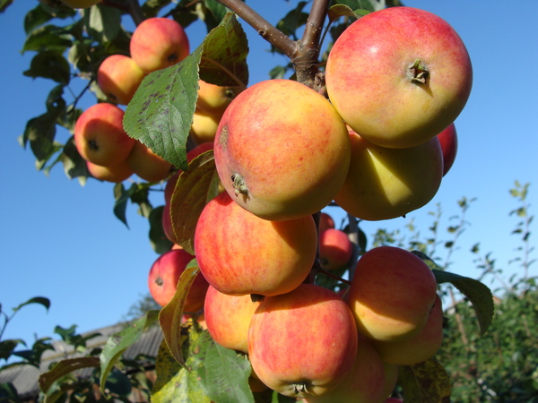 | ЧЕРВОНЕЦ Сорт осенний, яблоки весом по 120-160 г, отдельные до 350 г, ярко-красные, созревают в конце сентября. Нуждается в переопылении, в холодное лето закладывается цветковых почек меньше нормы. В соцветии завязываются по 1-2 плода. По вкусу не уступает наиболее ценным сортам. |