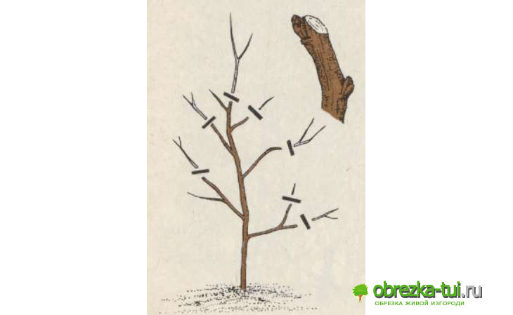 Первая обрезка предусматривает стрижку «на пень» и сохранение 2-5 самых сильных и здоровых веток. На следующий год прореживают плохо развитые побеги и выросшую поросль, оставшиеся веточки укорачивают.