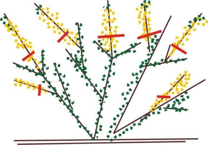 Эта декоративная культура многих цветоводов привлекает именно длинными, ниспадающими цветущими ветками. Но чтобы получить пышное цветение, такие кусты также требуют обрезки. Ее проводят по следующей схеме:
