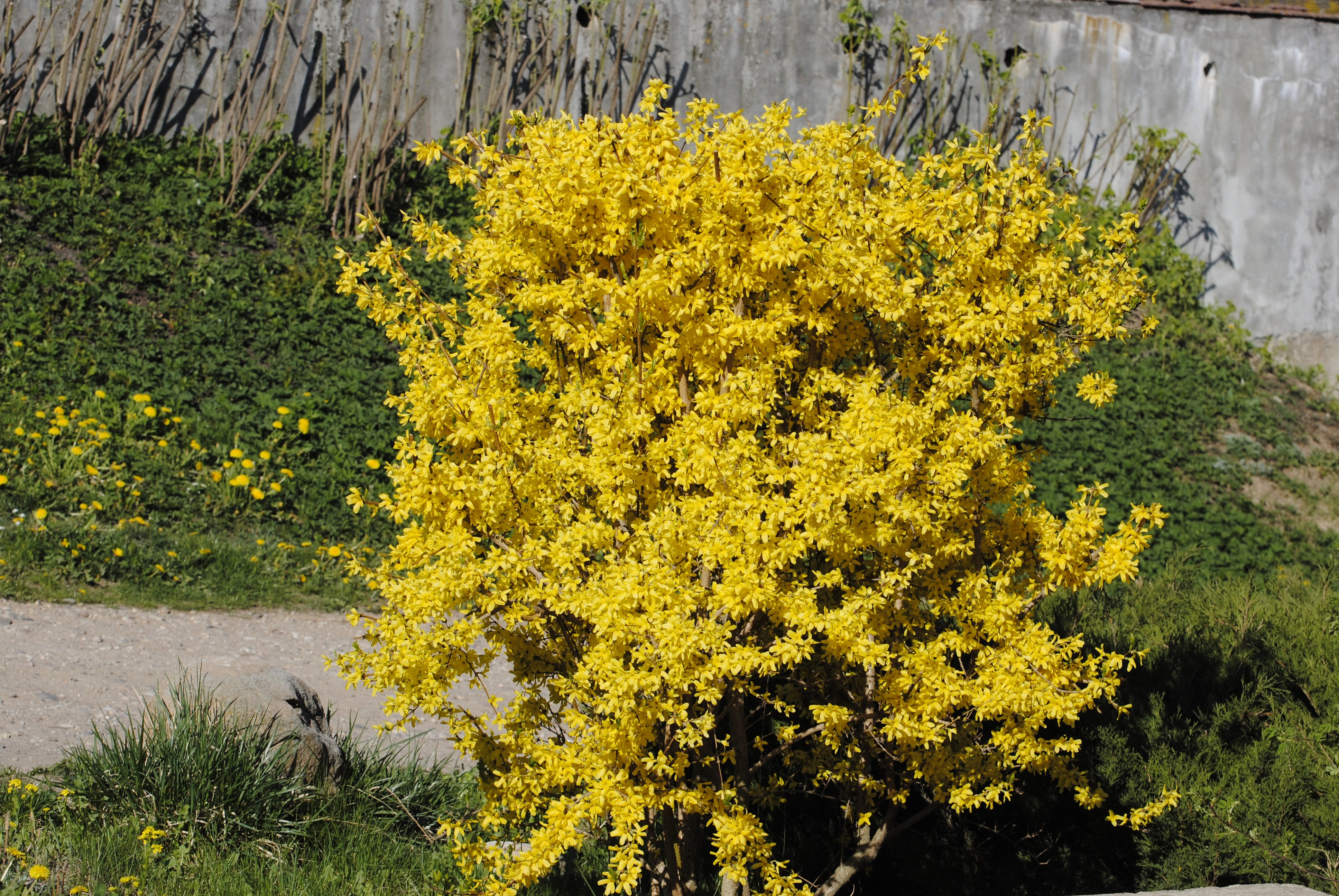 Мой ряд форзиций получает тень от соседских деревьев ближе к вечеру, но на этом все.