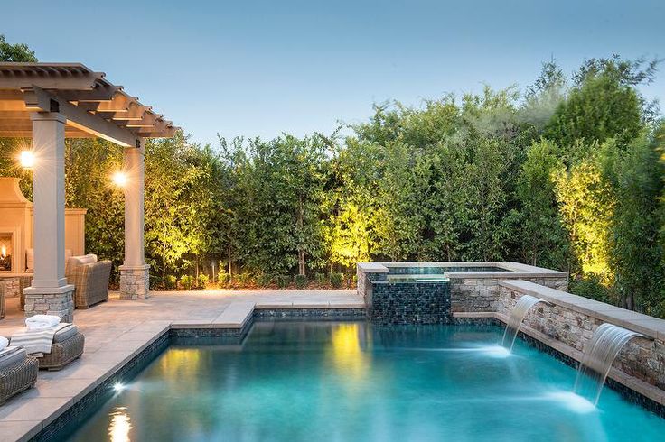 Этот прямоугольный бассейн совсем не простой. Благодаря тщательно подобранному сочетанию натурального камня, плоского камня для патио и плитки это мечта пловца. Еще лучше джакузи с бесконечным выступом, который действует как источник нагретой воды для бассейна внизу. Для дворов с бассейнами уход за газоном может стать главным, ознакомьтесь с нашим руководством о том, как засеять газон как профессионал.