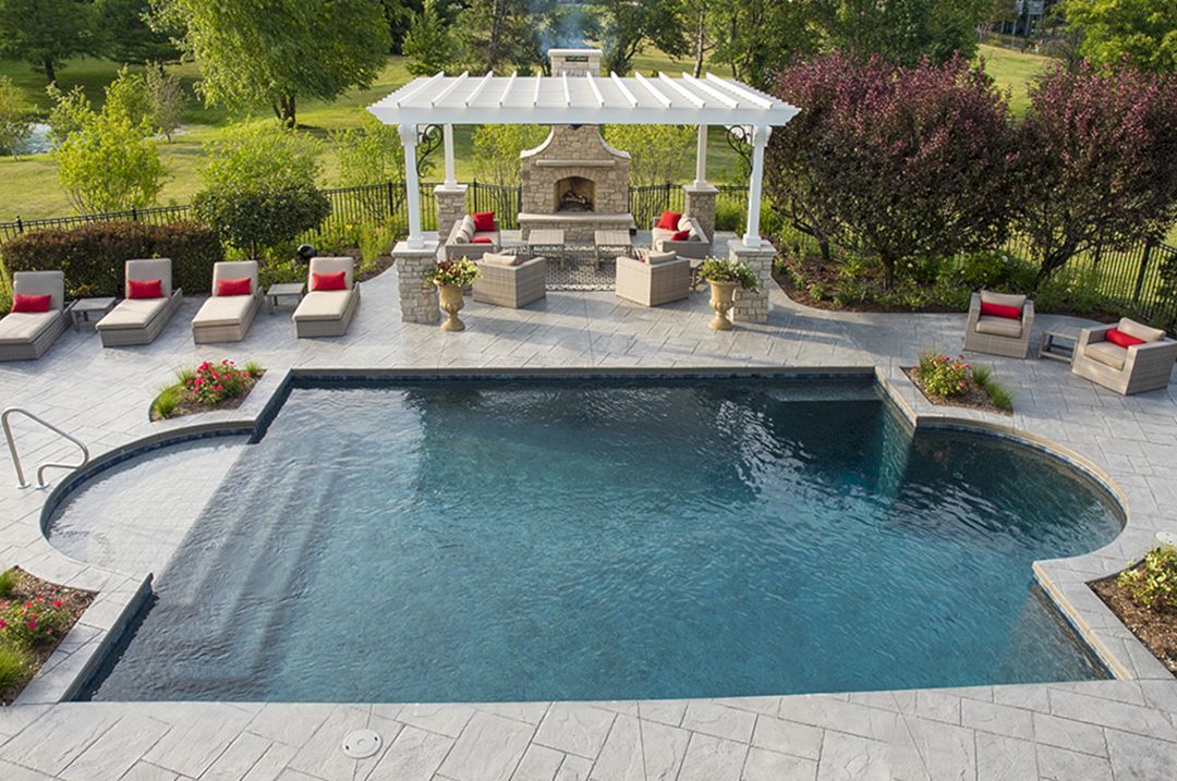 В этой зоне отдыха у бассейна есть все — симметрия, тень и большой камин для прохладных летних вечеров на воде.