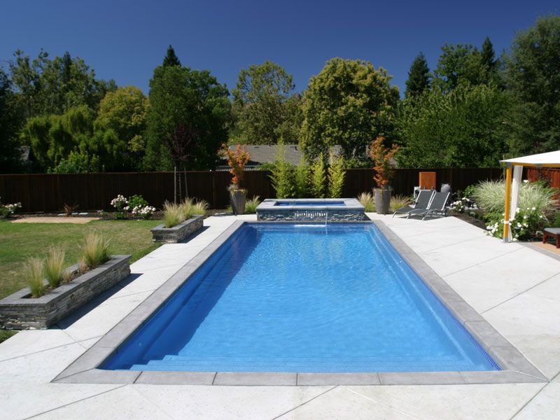 Идея дизайна: прямоугольный, спортивный бассейн среднего размера на заднем дворе в стиле модернизм с покрытием из бетонных плит