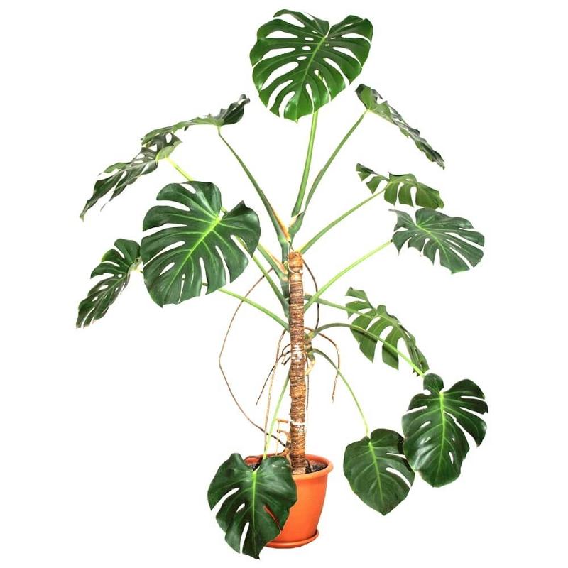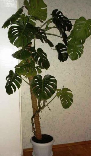 Цветок монстера выглядит как м многолетняя травянистая лиана с толстыми стеблями и очень крупными листьями, украшенными отверстиями. Молодые листья цельные, с возрастом листва украшается прорезями, а потом становится и полностью разрезной. В комнатных условиях листья монстеры в среднем имеют длину порядка 30 см, но могут быть и значительно больше. Монстера является лианой, но в комнатных условиях ей придают вертикальную форму при помощи различных опор. Это делается для того, чтобы уменьшить площадь, занимаемую этим крупным растением в помещении. Желательно, чтобы воздушные корни растения достигали почвы.