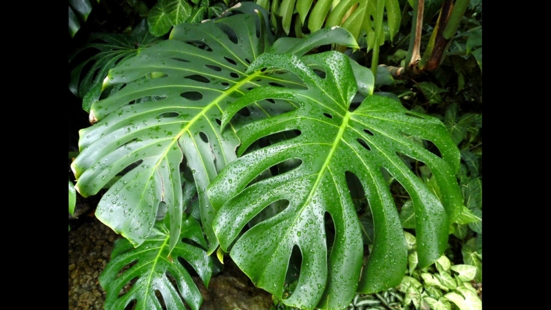 Монстера лакомая (Monstera deliciosa) – мощная лиана влажных тропических лесов Центральной и Южной Америки. Длина лианы до 20 м и множеством длинных воздушных корней. Листья крупные, до 40 – 70 см в диаметре, овально-сердцевидные с многочисленными отверстиями или перисто-рассеченные на доли, длинночерешковые, длина черешка достигает 1 м, молодые листья цельные.