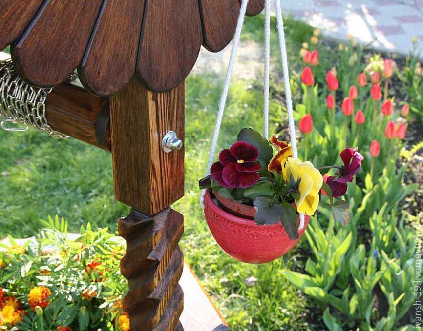 Один из самых красивых способов декоративного оформления колодцев – это окружение его густорастущими цветами. Например, в качестве цветника часто используют крышу колодца. Но цветы можно расположить и на боковых стенках в подвесных кашпо, и поставить в горшках на оголовке колодца, и даже окружить его основание, расставив цветущие растения по периметру колодца.