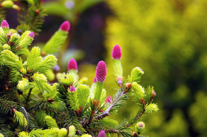 Женские цветки образуют небольшие шишки, которые после опыления превращаются в те самые еловые украшения.