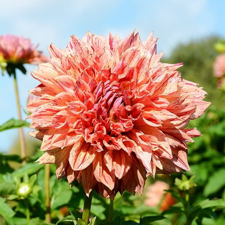 Махровое соцветие-корзинка диаметром до 10-15 см состоит из светло-оранжевых язычковых цветков, формирующих не замкнутую до конца сферу. Куст требует нормирования нагрузки или усиленного питания, так как бутонов формирует очень много. Цветение начинается в начале лета и продолжается до первых заморозков.