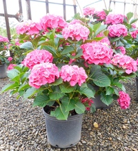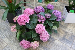 Маленькие кустики гортензии с ярко-розовыми и фиолетовыми цветками.
