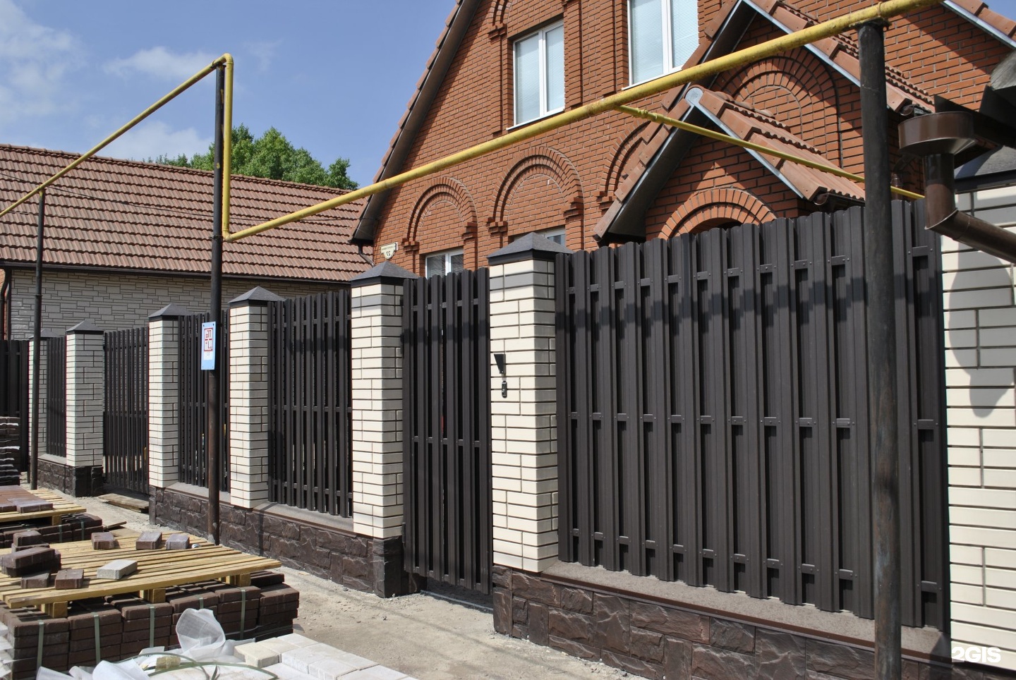 Ограждение из профнастила и кирпичных столбов. Забор удачно сочетается с фасадом частного дома.