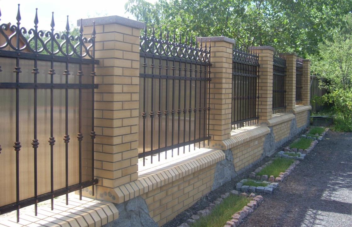 Это один из видов заборов, устанавливаемых на даче. Ограждение изготовлено из поликарбоната и металлических элементов.