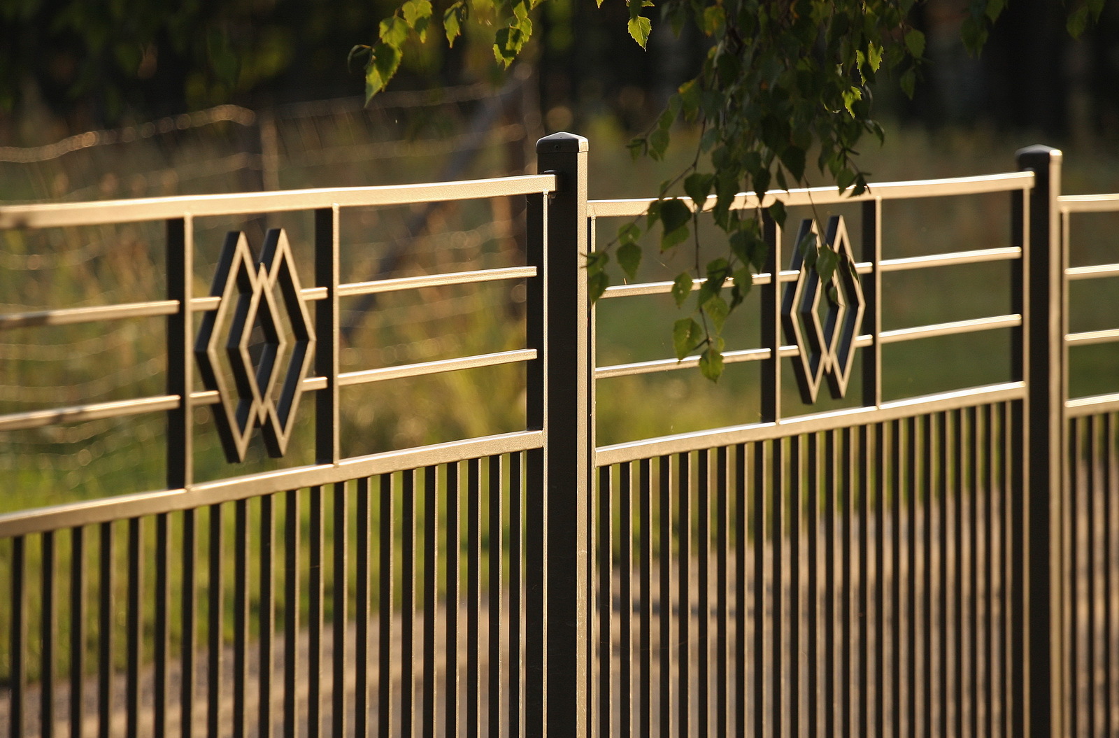 - Декоративные функции. Последние десятилетия активизировалось строительство загородных домов. Люди предпочитают работать в мегаполисах, а жить за городом. Вместо сада и огорода на участках зеленый газон, цветы, декоративные деревья и прочие элементы ландшафтного дизайна. Иногда хозяева строят высокие, но открытые заборы, чтобы показать красивый двор соседям. Основание и столбы выстраивают из кирпича или дикого камня, а саму изгородь – из ажурного кованого металла.
