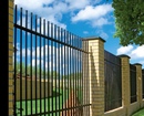На фотографии представлен забор, изготовленный из металлического штакетника темного цвета и кирпича.
