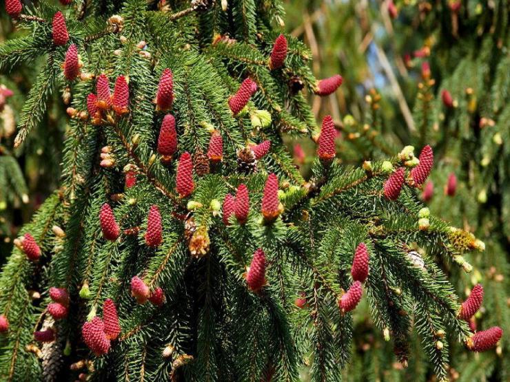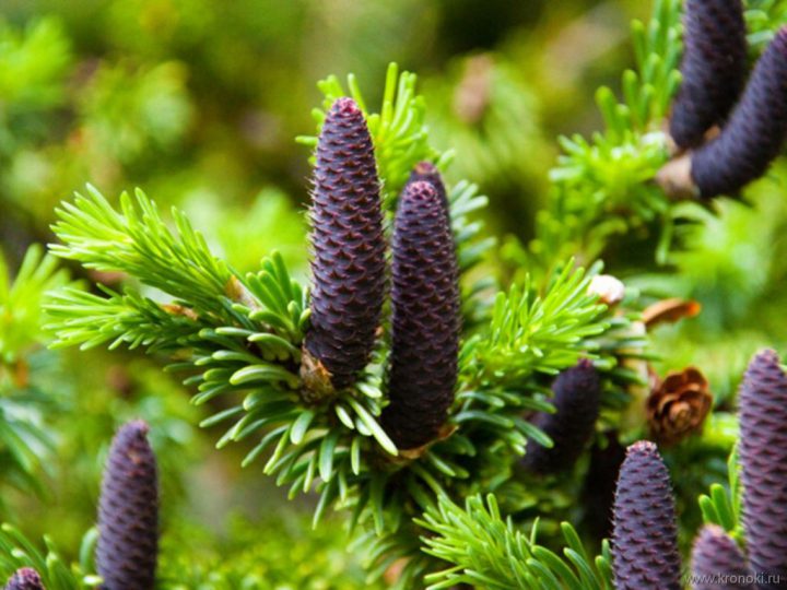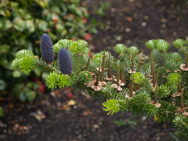 Пихта бальзамическая является очень декоративным видом, благодаря большому количеству молодых темно-фиолетовых шишек.