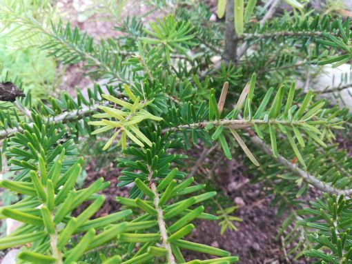 Хвоя мягкая, около 2,5 см в длину, темно-зеленая, блестящая сверху, снизу — с белыми полосками. В ветреную погоду это придает дереву серебристо-белый оттенок.