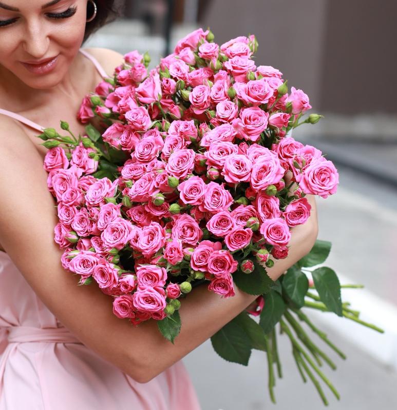 красивые цветы к празднику. женщина с красивыми цветами в руках в помещении фон. букет цветов для цветочного магазина.ПРЕМИУМ