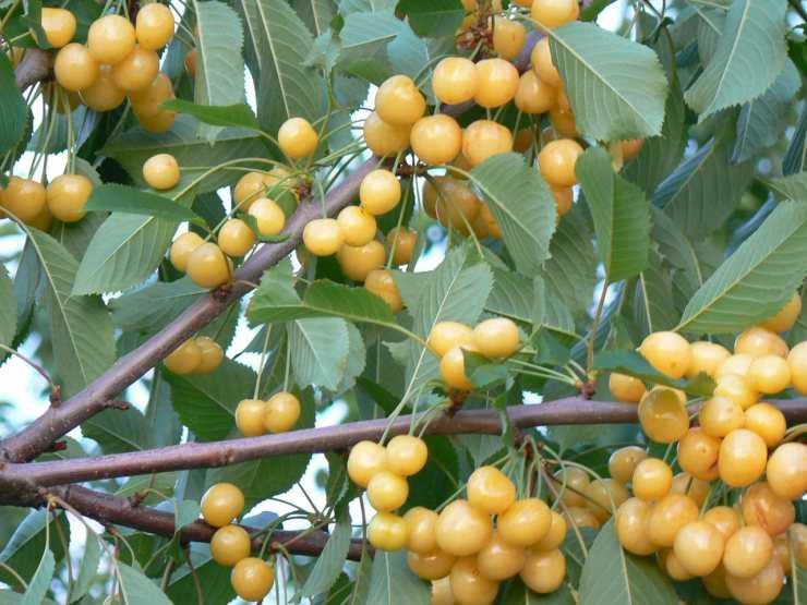 Крупные плоды можно собирать уже в мае. В то время как птицы будут есть эти вишни, они не так привлекают их, возможно, из-за их желтого цвета.