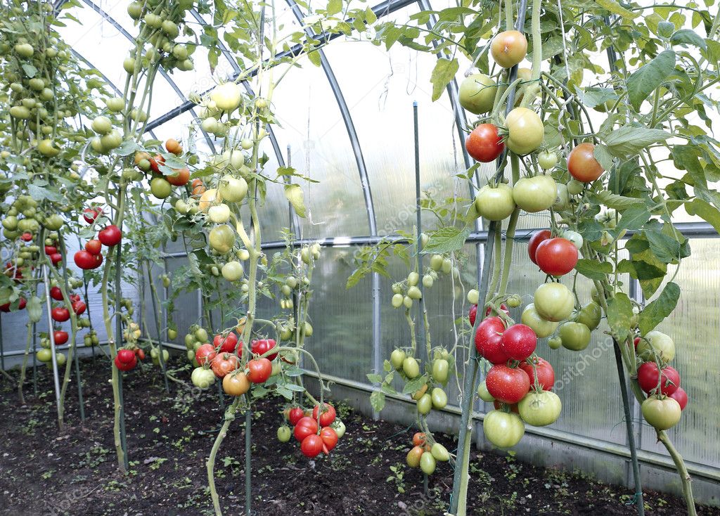 Теплица для натуральных томатов. красивые красные спелые и зеленые помидоры, выращенные в теплицеPREMIUM