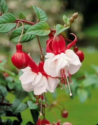 Листья фуксии, зеленые или чуть красноватые, овальные, супротивные, слегка заострены и зазубрены по краям. Цветет фуксия обильно и продолжительно поникающими цветками, состоящими из яркой чашечки и трубчатого венчика с отогнутыми краями. Лопасти чашечки длиннее лепестков, а тычинки длиннее чашечки. Цветы фуксии – на длинных цветоножках, окраска цветков розовая, белая, красная, оранжевая, кремовая, лиловая, фиолетовая – иногда по три разных оттенка в цветке. Плод – съедобная ягода.