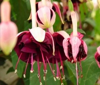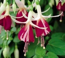 | Фуксия ‘Mrs. Popple ’: Харди куст. Одиночные цветы алого и темно-фиолетового цветов | Фуксия ‘Garden News’: устойчивый кустарник.Полумахровые цветы бледно-розового и пурпурного цветов |
