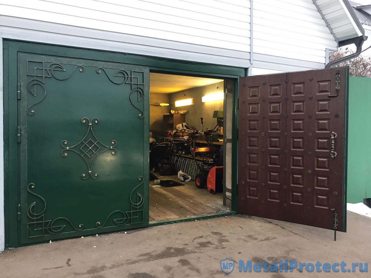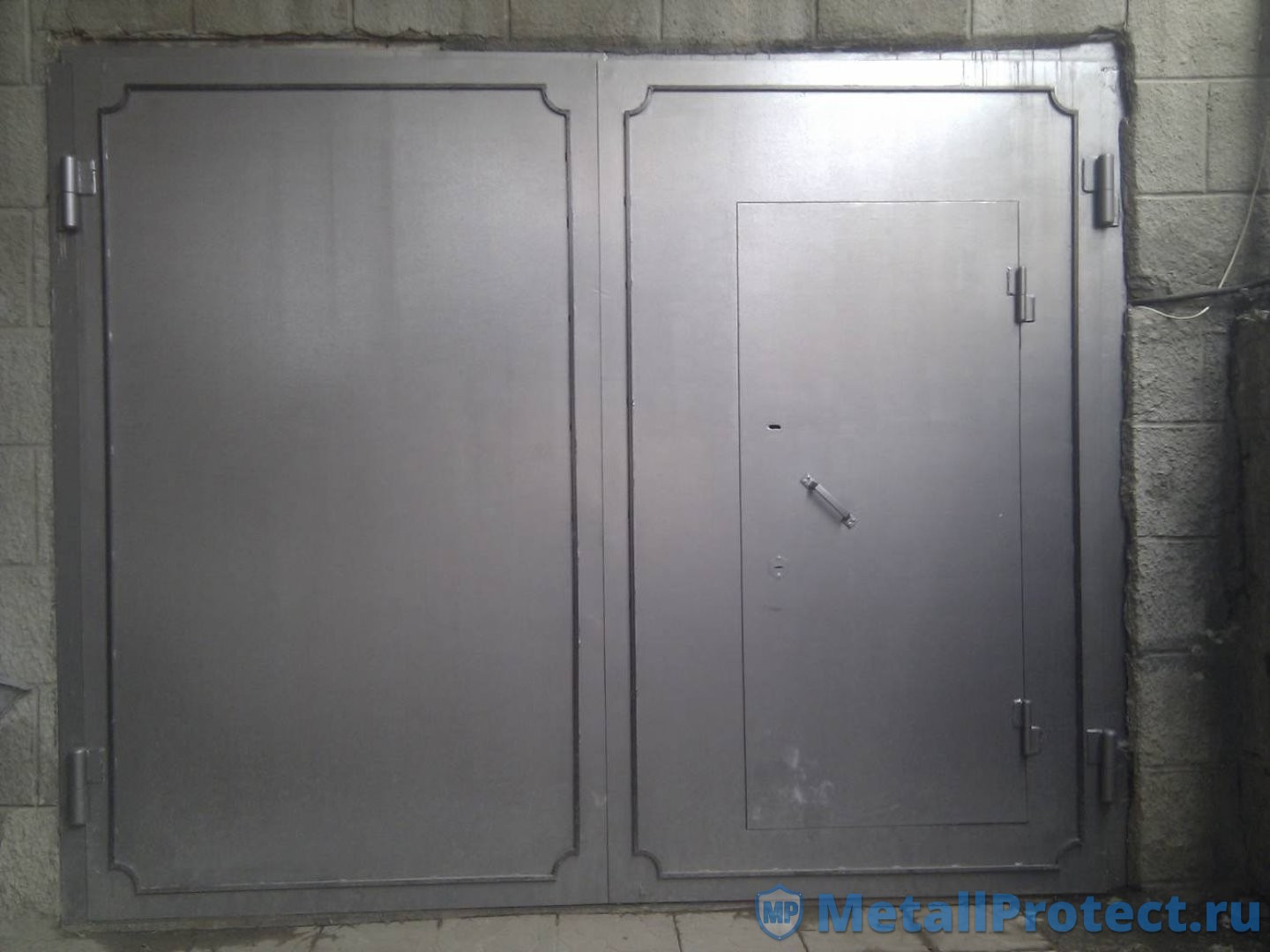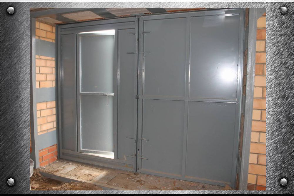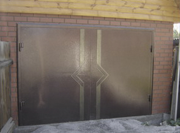Производятся такие ворота из прочной стали. Ее дополняют и утепляют специальные накладки. Также для облицовки ворот используется сталь или эмаль. Держится вся эта конструкция на прочной раме. Как правило, ее выполняют их таких материалов, как древесина или прочная сталь. Она способна выдержать даже большой вес ворот. Конструкции такого типа не подходят для гаражей нестандартного размера. Даже для помещения, рассчитанного на два автомобиля, человеку придется подыскать другой вариант.