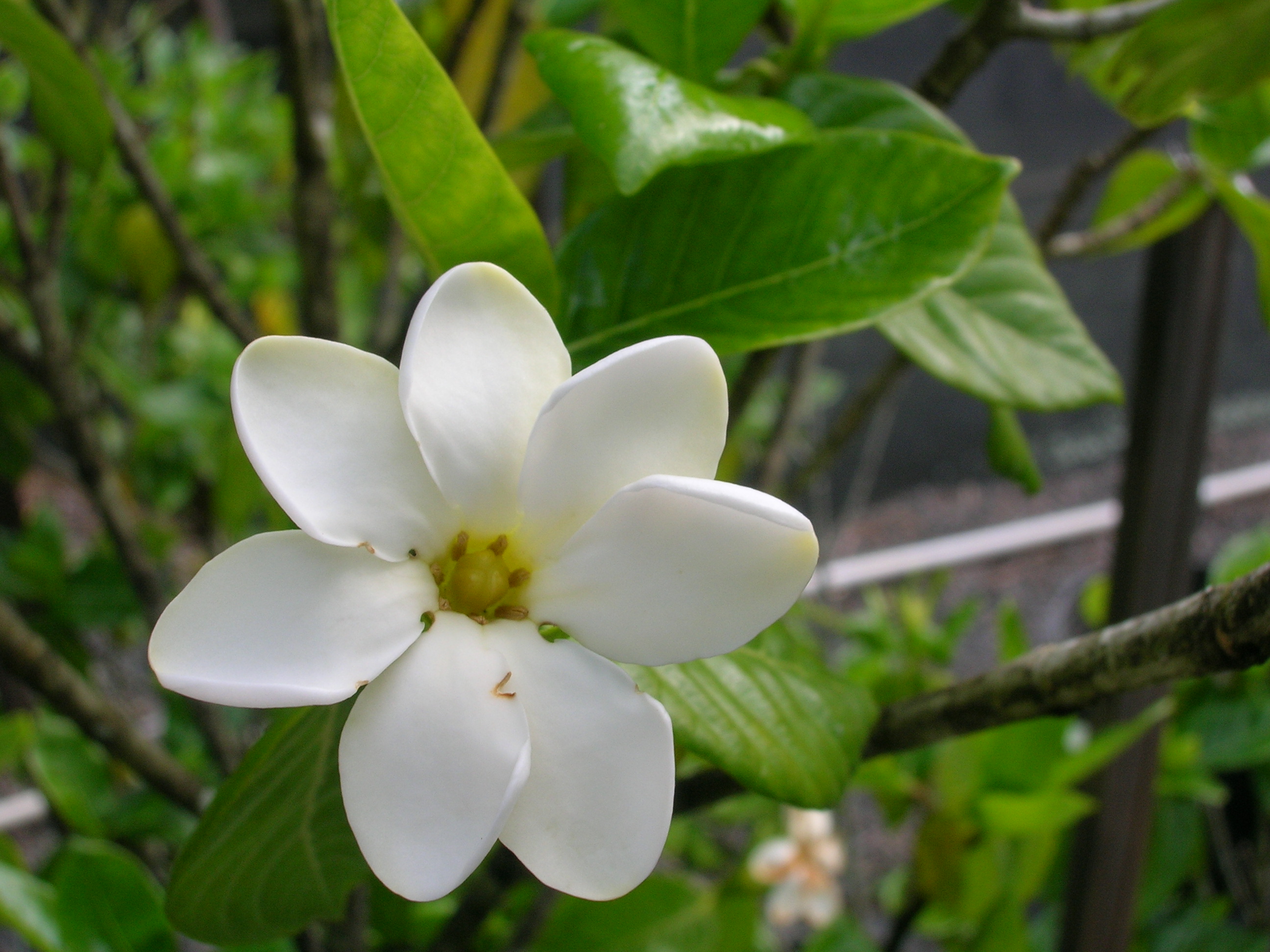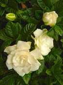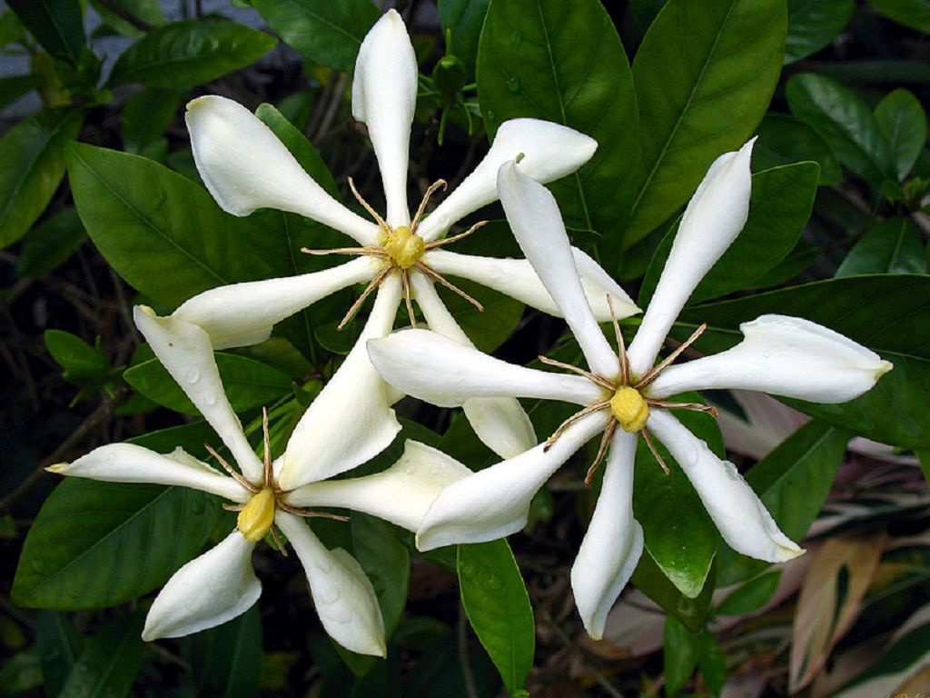 1) Жасминовидная (G. Jasminoides ellis) – красивый кустарник в природе вырастает около 2 м, в комнатных условиях не более 60-70 см. Не теряет своей привлекательности круглый год. Нарядные кожистые, темно-зеленые листья размещаются попарно, друг напротив друга. В период цветения, который при должном уходе может продолжаться все лето, на краях зеленых побегов красуются белые цветы звездчатой формы, собранные в соцветия. Роскошные цветы имеют приятный, довольно резкий аромат.