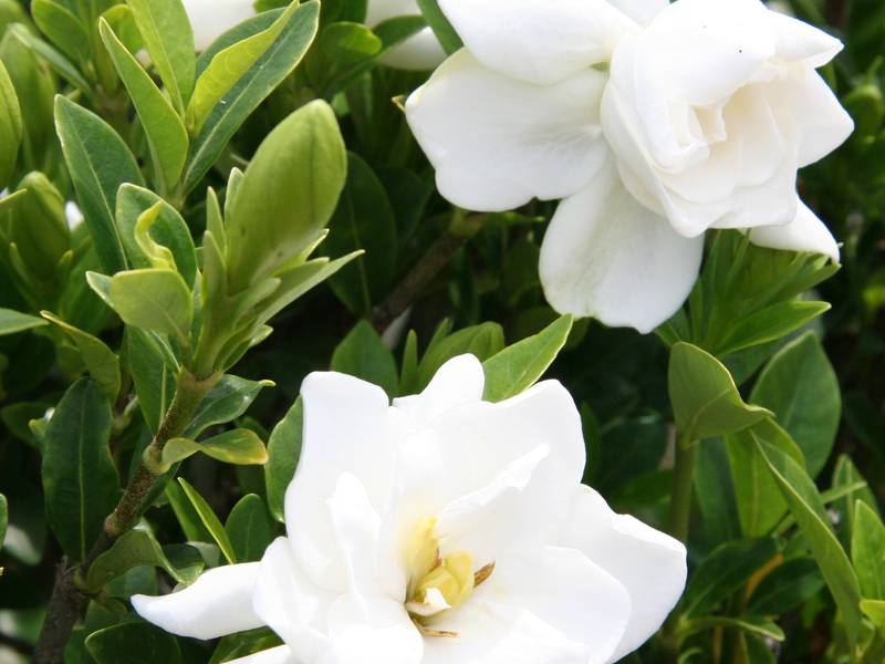 Крупные белые цветы гардении, с виду очень похожие на розы, с превосходным ароматом, никого не оставят равнодушным. Махровые бутоны густо расположены на стеблях растения, цветение продолжается с начала лета до осенних холодов.