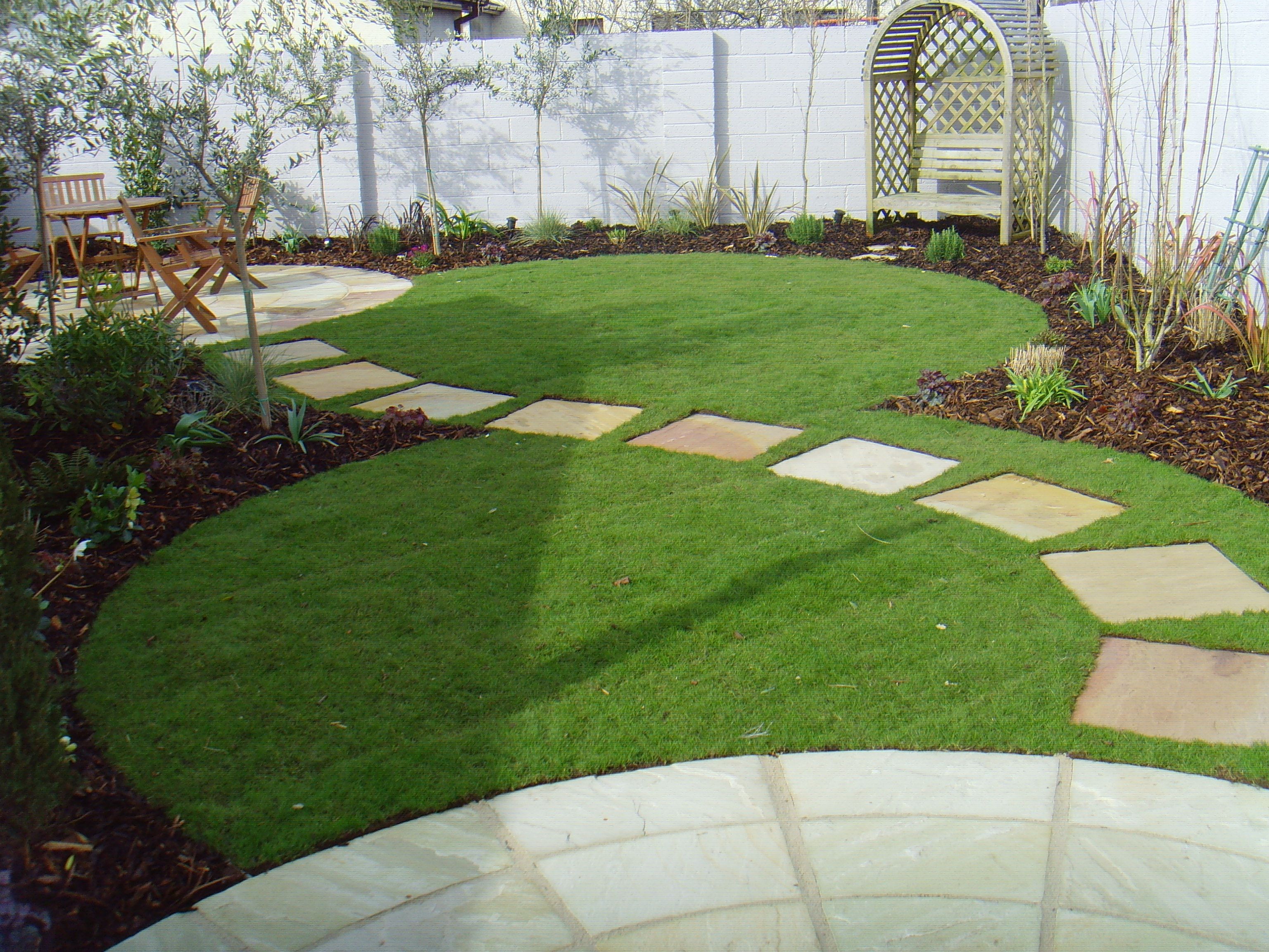 Оформить газон также можно с помощью дорожки, которая пересекает его или проходит вдоль кромки. Причем вариантов того, какую дорожку сделать, очень много. И каждая из них наделит газон своими неповторимыми особенностями.
