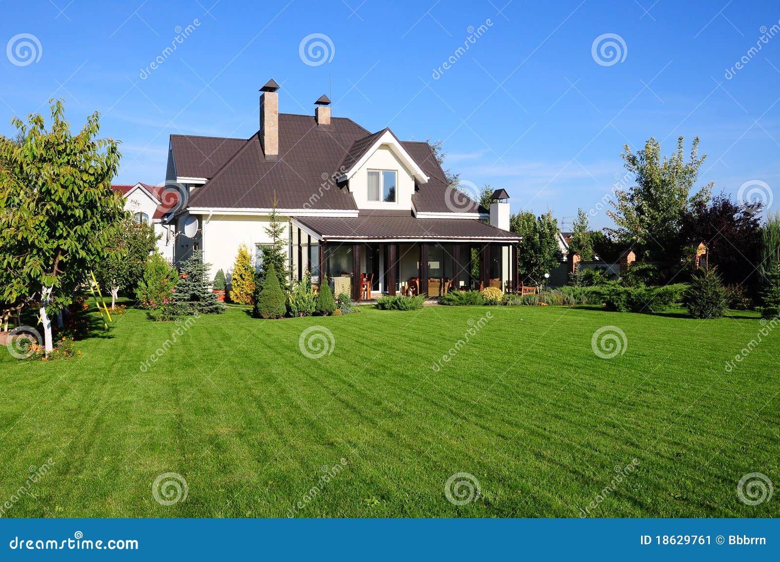 А если добавить перед домом небольшой партер из стриженного низкорослого кустарника (например, из самшита), то газон приобретет черты французского стиля.
