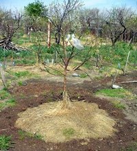 С помощью опилок, перегноя или листвы замульчируйте участок под кроной персика.