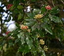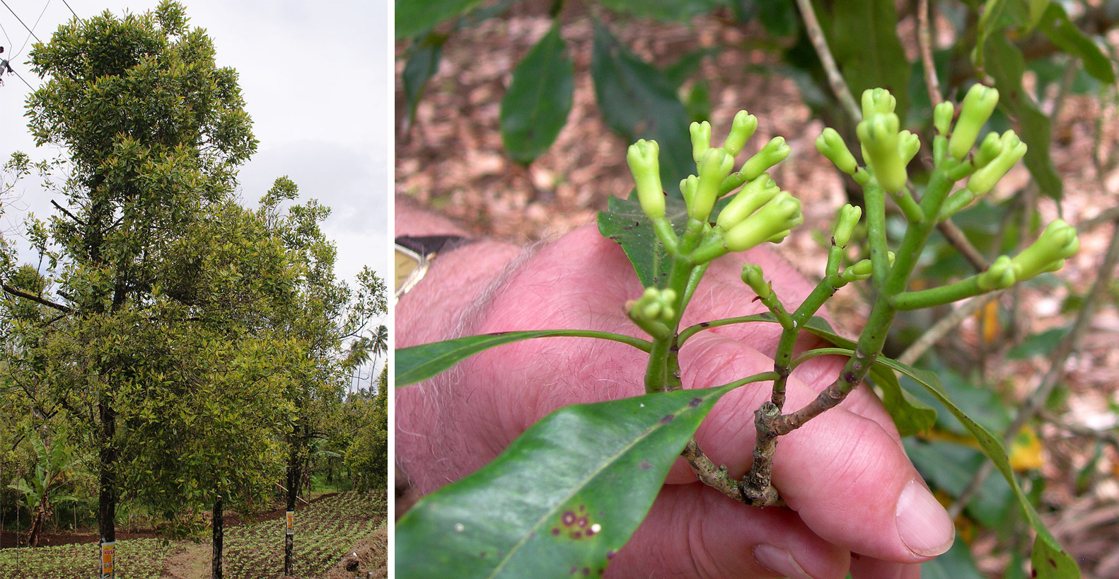Гвоздика — Syzygium aromaticum, Семейство миртовые — Myrtaceae. Вечнозеленое тропическое дерево высотой до 20 м, с красивой пирамидальной вершиной. Листья супротивные, широко ланцетовидные, цельнокрайные, темно-зеленые, кожистые и блестящие, на поверхности заметны светлые точки — эфиромасличные вместилища. Соцветия верхушечные, в виде сложных полузонтиков. Цветки состоят из ярко-красного цилиндрического цветоложа, несущего вверху 4 мелких красных чашелистика, и бледно-розового 4-лепестного венчика, опадающего при распускании в виде полушаровидного колпачка; тычинок много, завязь нижняя.