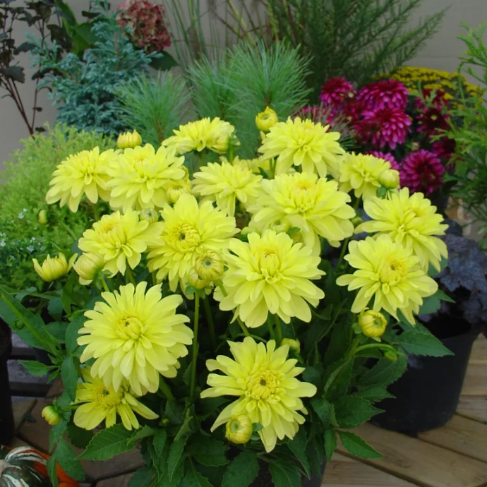 - ‘Yellow Perception’ : Изобилие 4-дюймовых цветов с маслянистыми желтыми лепестками с белыми кончиками.