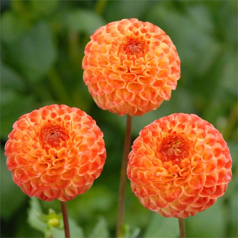 Вид: помпонная. Цветки этого помпонного георгина шириной 5 см переходят из золотого апельсинового оттенка в насыщенный оранжевый на внешних краях лепестков. Прекрасно подходит для срезки.