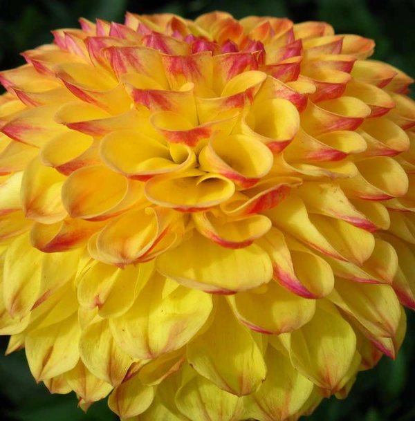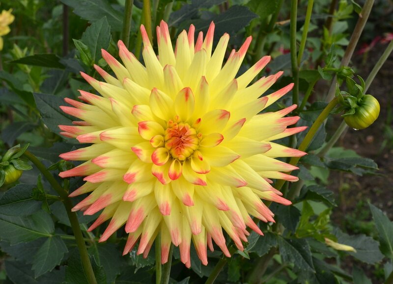 Дахлина Максим часто используется для создания цветочных композиций. Это декоративный сорт, выведенный селекционерами искусственно. Имеет необычный характерный окрас и форму лепестков. Они ярко-красные с оранжевым отливом, а по краю каждого лепестка есть желтая кайма.Каждая из них немного вогнута к стеблю, поэтому соцветие имеет особую мозаичную форму. Кусты невысокие, по сравнению с другими сортами, но довольно пышные. Цветки появляются на ровных стеблях, в окружении яркой зелени с бронзовым отливом.
