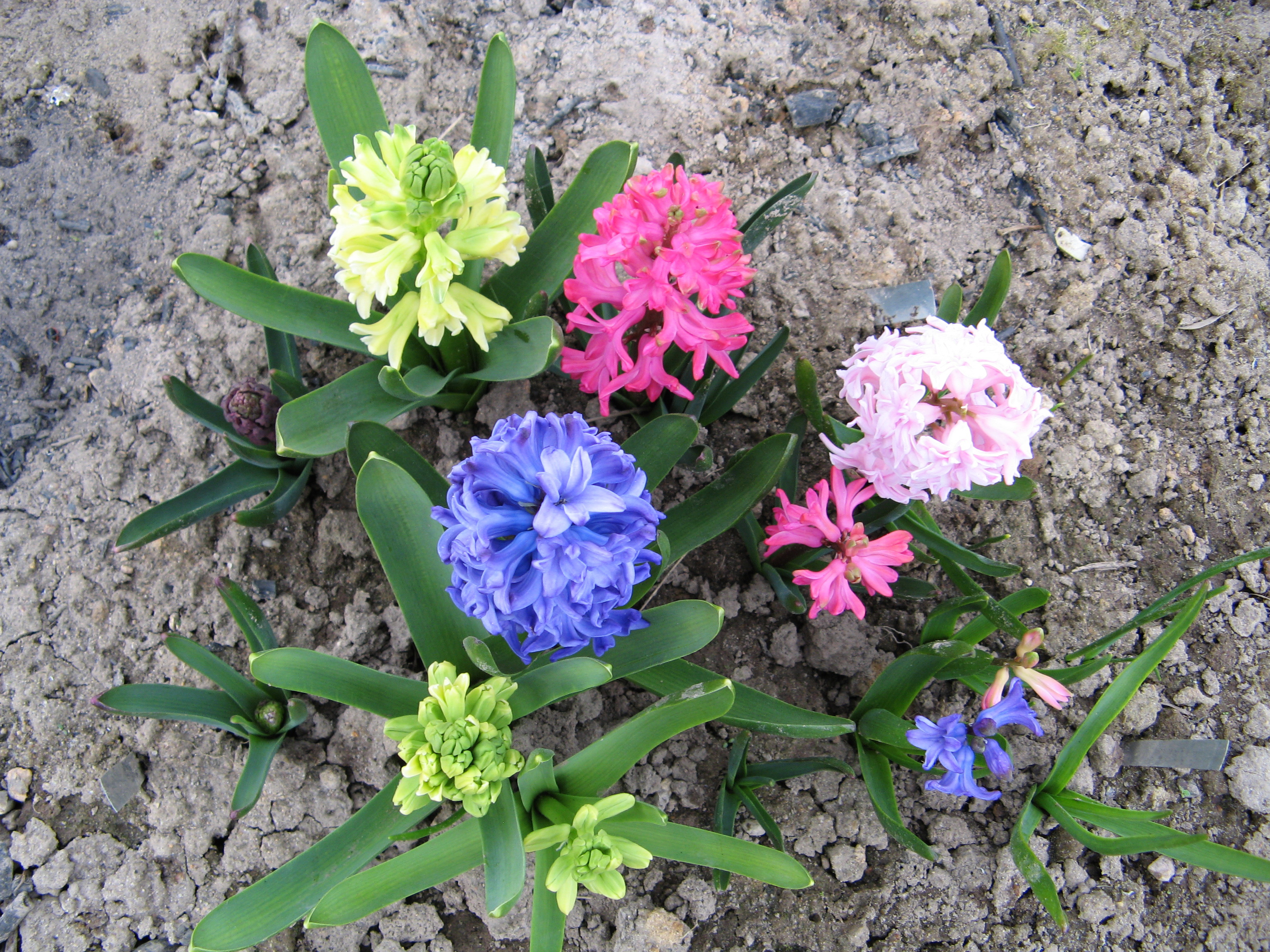 Гиацинты на клумбе (фото Надежды Абрамович, Краснодар)Ранней весной, как только сойдут снега, из земли прорастают зелёные стрелочки гиацинтов. Этот цветок с чарующим и ярко выраженным ароматом разнится всеми оттенками радуги. Соцветия в форме кисточек могут быть как обычными, так и махровыми по структуре, на цветоносе обычно располагается 20-30 бутончиков.