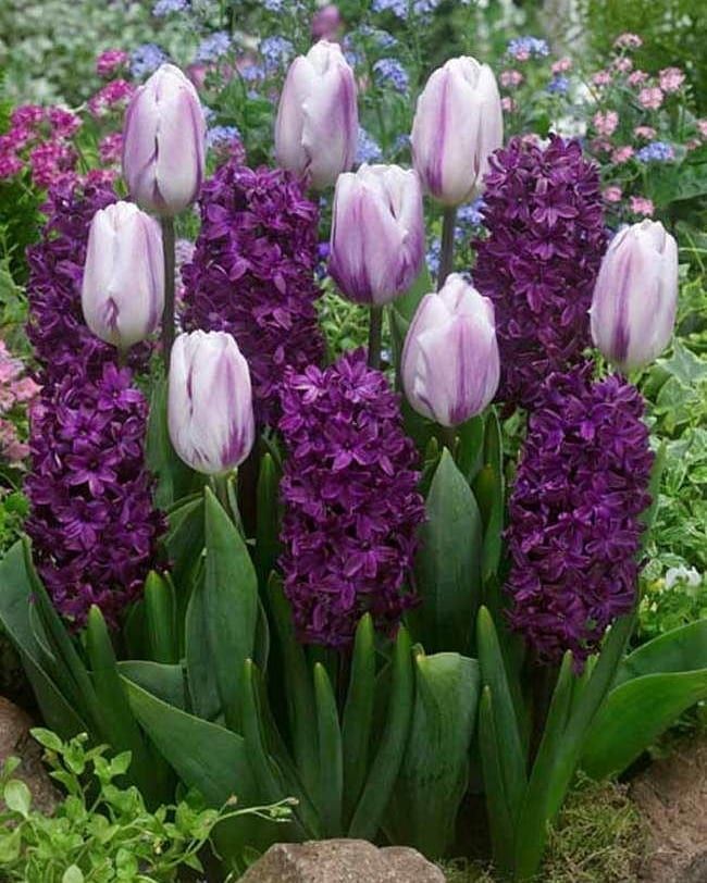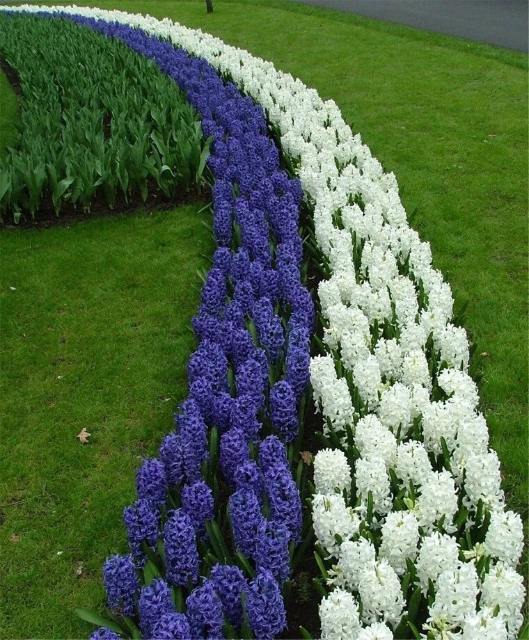 При посадке гиацинтов среди других растений сажайте их группами не менее чем по 5 луковиц. В одном из моих многолетних садов я сажаю смесь оттенков синего группами по 5-7 луковиц, расположенных на расстоянии около 4 футов друг от друга вдоль передней части грядки. Ритм этих повторяющихся луж голубого цвета притягивает взгляд к дорожке и наполняет благоуханием весь передний двор.