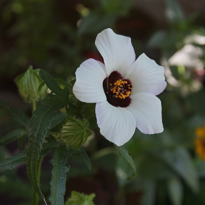 Гибискус тройчатый – это невысокое (до 70 см) травянистое растение из семейства Мальвовых (Malvaceae) с прямостоячим, угловато изогнутым в узлах стеблем. Стебель ветвящийся, густо покрыт волосками. Корень стержневой.