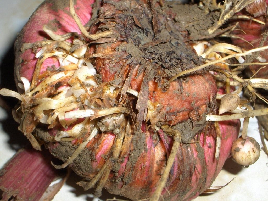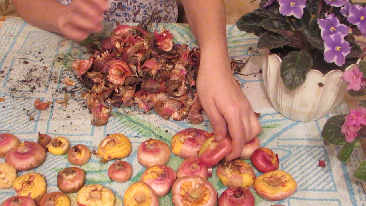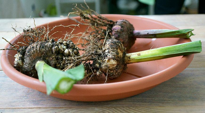 - У взрослых клубнелуковиц корни и старую, материнскую клубнелуковицу удаляют сразу. Это уменьшает срок просушивания посадочного материала и предотвращает распространение заболеваний.