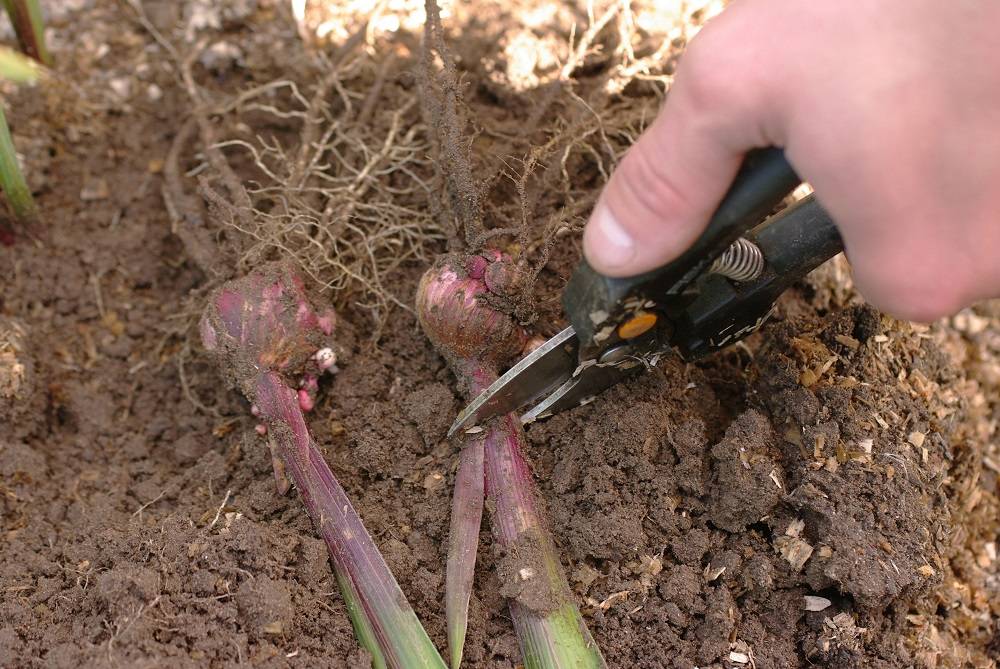 - Землю стряхивают с луковиц лишь после того, как она немного подсохнет. Клубни разделяют и собирают деток. Стебли срезают, отступая 5 см от клубня. Луковицы с признаками заболеваний, а также старые следует выбросить.