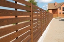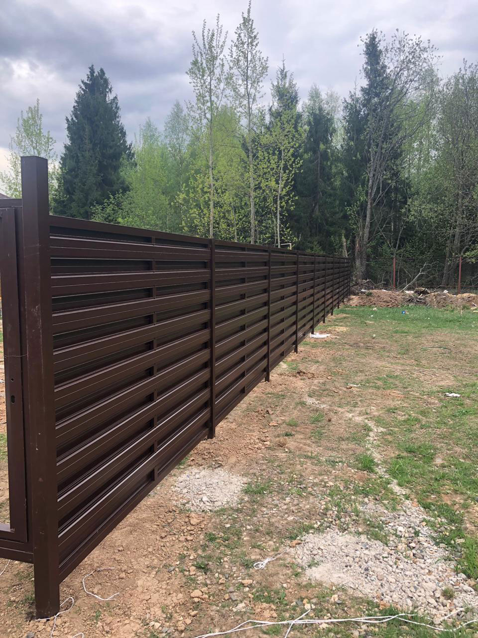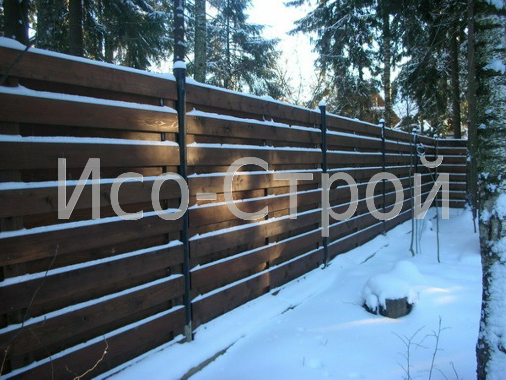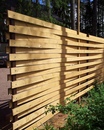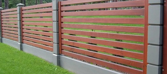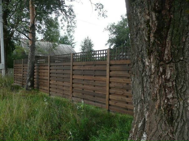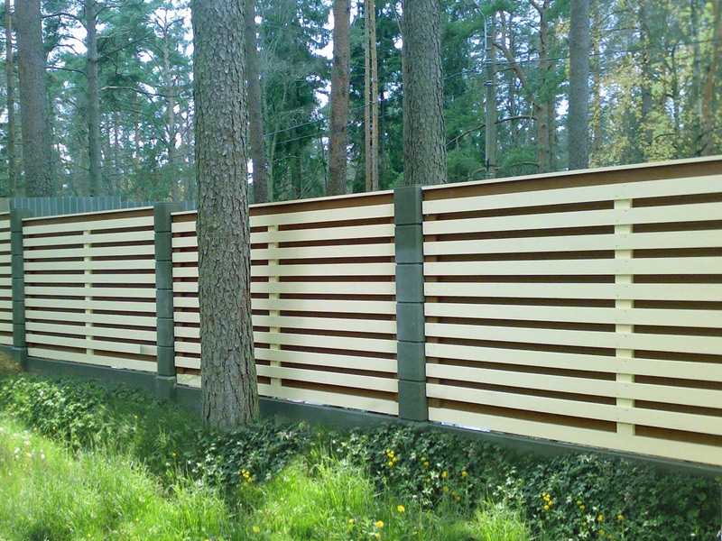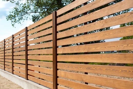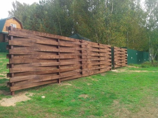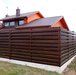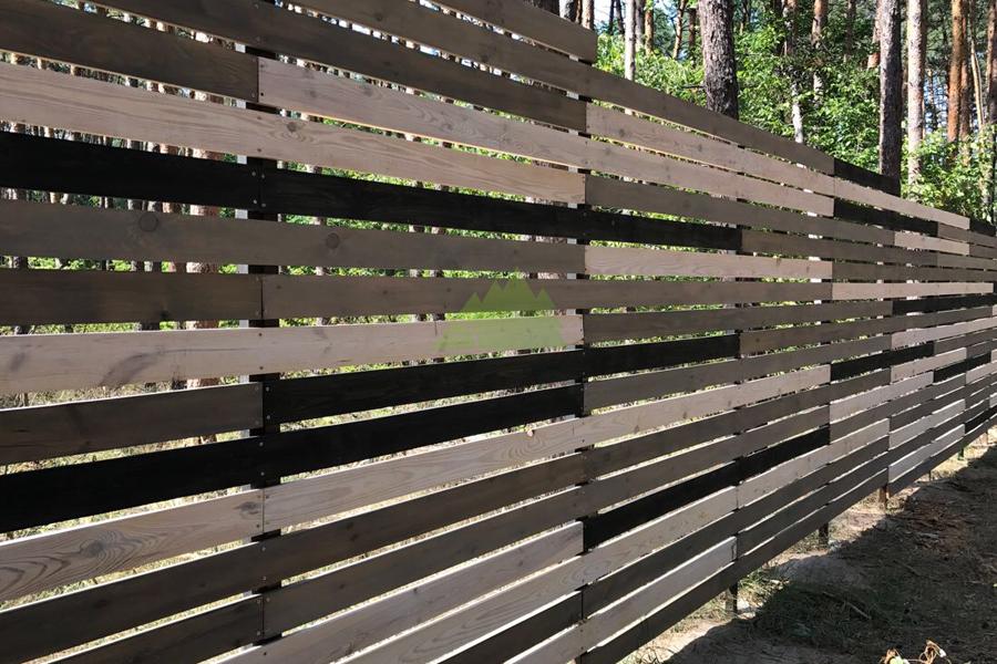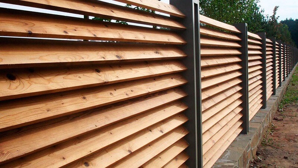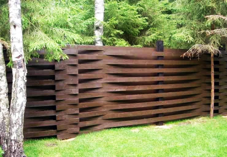 Ограждение в форме горизонтальной лесенки можно часто встретить на дачных участках. Монтаж забора также достаточно прост в исполнении.