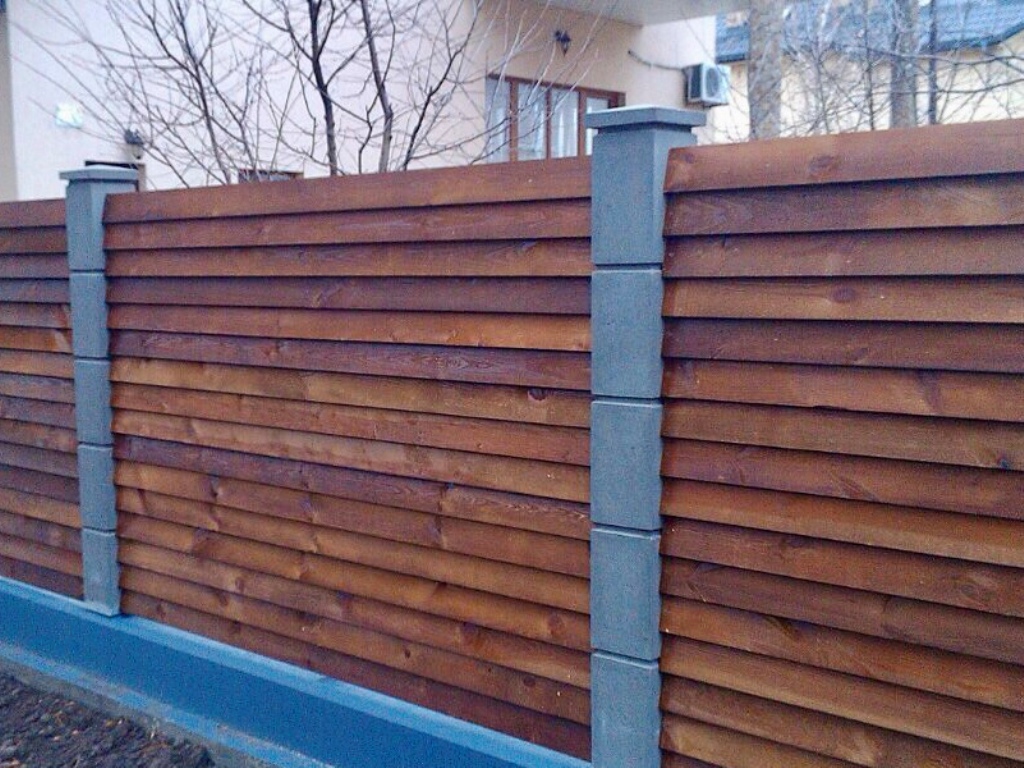 Чаще всего материал для комбинирования в деревянном заборе используют для изготовления цоколя (так конструкция становится крепче, надежнее и долговечнее) или колон (столбов), к которым крепится древесина (по тем же причинам).