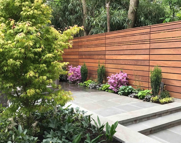Горизонтальный деревянный забор обычно поддерживают бетонными или каменными столбами. Комбинация подходит для современного и современного дизайна и может быть легко связана с другими элементами и конструкциями, включая садовую дорожку, фасад дома или террасу.