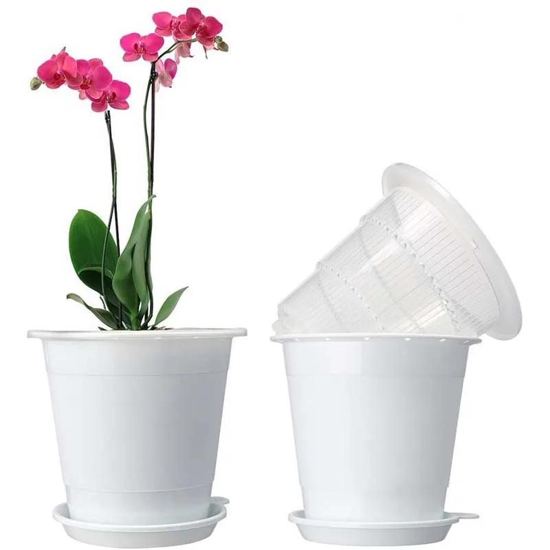 Орхидеи часто продаются в прозрачных пластиковых горшках с дренажными отверстиями в основании для стока лишней воды, а также часто имеют отверстия сбоку горшка, позволяющие большему количеству воздуха циркулировать вокруг корней орхидей, поскольку орхидеи являются эпифитами.