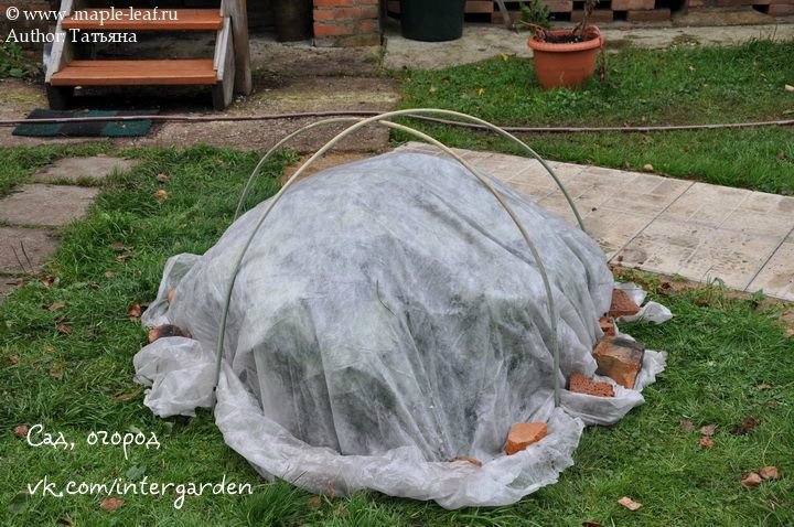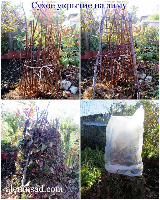 Если куст уже достаточно старый, то его ветки не получится согнуть и укрыть подобным способом. Поэтому он оборачивается лутрастилом и закрепляется веревкой. Затем над растением сооружается металлический каркас в виде сетки, который нарывается листами рубероида. Внутрь каркаса засыпается сухая листва.