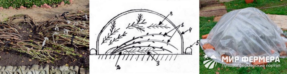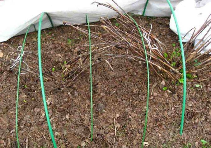 Зачастую применяется метод укрытия приствольного круга лапником. Для этого ветки в радиальном положении пригибают к земле, а основание кустарника засыпают торфом. Чтобы зафиксировать побеги, их закрепляют деревянными или металлическими скобами. Ветки накрываются лапником, а затем лутрастилом, который необходимо прижать какими-нибудь тяжелыми предметами. Отлично подойдут кирпичи или доски.