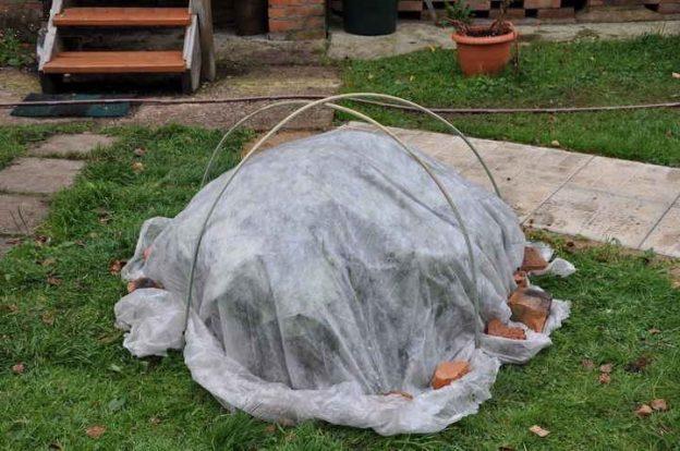 - При установившихся отрицательных температурах около -5°C натянуть второй слой агроволокна или полиэтилен, тщательно прижав камнями по периметру. В случае оттепели края плёнки приподнимать для проветривания.