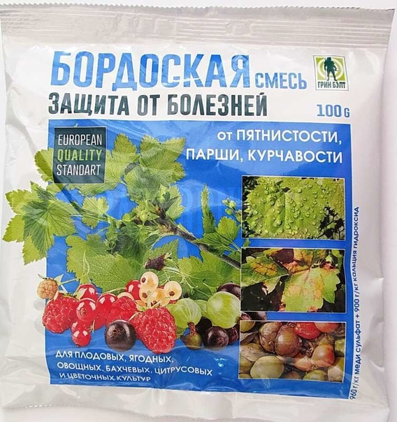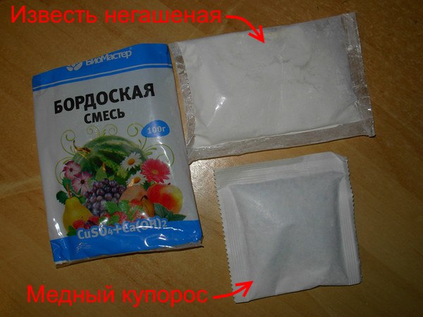 - Лучше всего купить готовую бордоскую смесь, разводить ее по инструкции и не заниматься самодеятельностью.Промышленная упаковка содержит медный купорос, известь и индикаторную бумагу. №