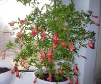 - Карликовый гранат, плоды которого в открытом грунте не превышают 70 грамм, куст вытягивается до 1 м в длину; в течение первого срока цветения появляются большие разноцветные цветы от ярко-красных до зеленоватых; с одного куста можно снять до 10 плодов, имеющих массу полезных для организма свойств, одним из которых является очищение пищеварительной системы;