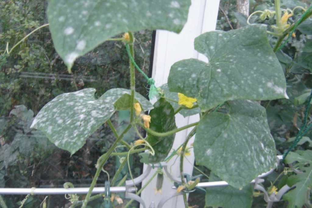 Данное заболевание проявляется на растении в виде появления белого налета, который начинает быстро разрастаться. Когда все листья белеют, они засыхают, что приводит к полной гибели огурцов.